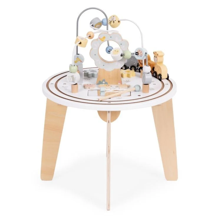 Drveni edukativni sto 5 u 1 je višenamenska igračka namenjena deci starijoj od 1 godine. Izrađen je od izdržljivih materijala – drveta, šperploče, MDF-a i metala – što obezbeđuje stabilnost i bezbednost tokom igre. Idealan je za upotrebu kod kuće, u vrtićima ili u dečjim igraonicama. Sto sadrži lavirint sa perlicama, drveni vozić sa simpatičnim životinjama, ogledalo, rotirajuće zupčanike i magnetne elemente za pecanje. Svaka aktivnost pomaže u razvoju koordinacije, logičkog razmišljanja i manuelnih veština. Kompaktne dimenzije i ergonomska visina radne površine pružaju udobnost, dok zaobljene ivice obezbeđuju sigurnost za najmlađe korisnike.