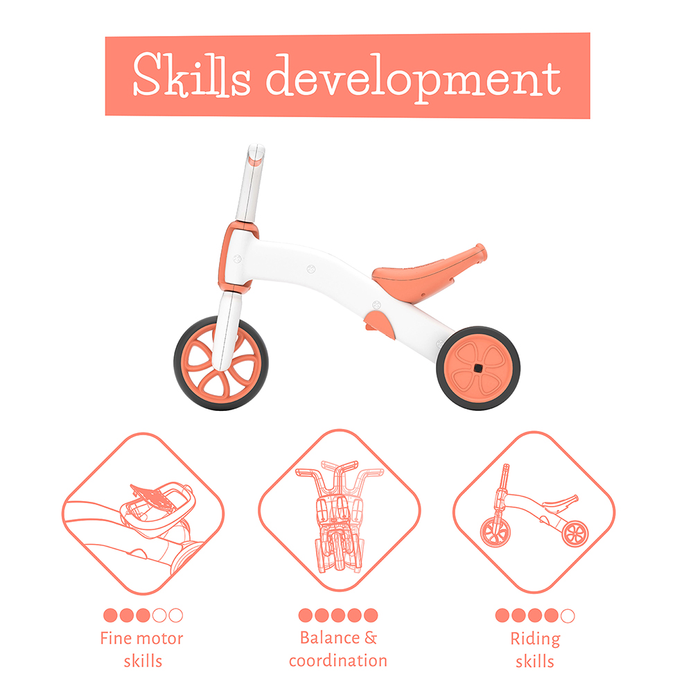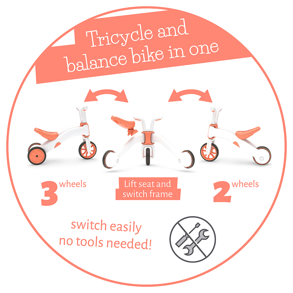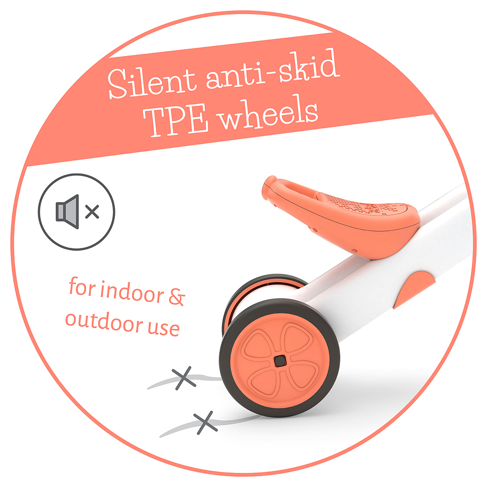 Prilagodljivo sedište raste zajedno sa detetom: 22 cm u tricikl modu i 26 cm u balans modu. Tihe, antisklizne i neostavljajuće tragove gume omogućavaju vožnju i u zatvorenom, dok su dovoljno izdržljive za igru napolju.
