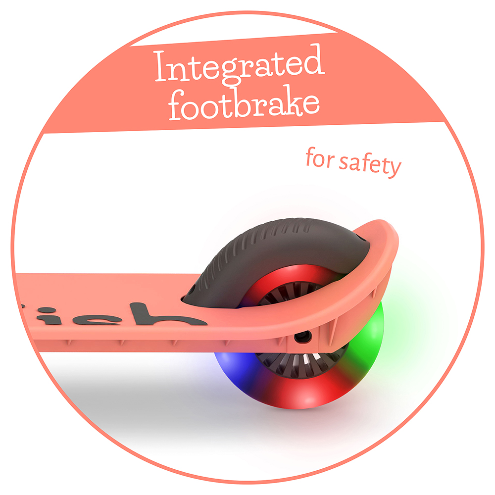 Čvrsta dvostruka platforma i integrisana nožna kočnica pružaju dodatnu kontrolu i sigurnost, a LED svetla u točkovima rade na principu kretanja – bez baterija.
