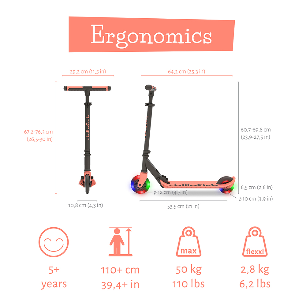 Trotinet Chillafish Flexxi Glow Flamingo LED donosi još više zabave i avanture u svaku vožnju. Zahvaljujući atraktivnim LED točkovima koji svetle tokom kretanja, svaka vožnja postaje pravi mali spektakl. Namenjen je deci uzrasta 5+ godina koja vole kretanje, igru i boravak napolju, a moderan dizajn i živopisne boje čine ga posebno privlačnim za svakodnevne avanture – bilo da se vozi do parka, dvorišta ili kod drugara.