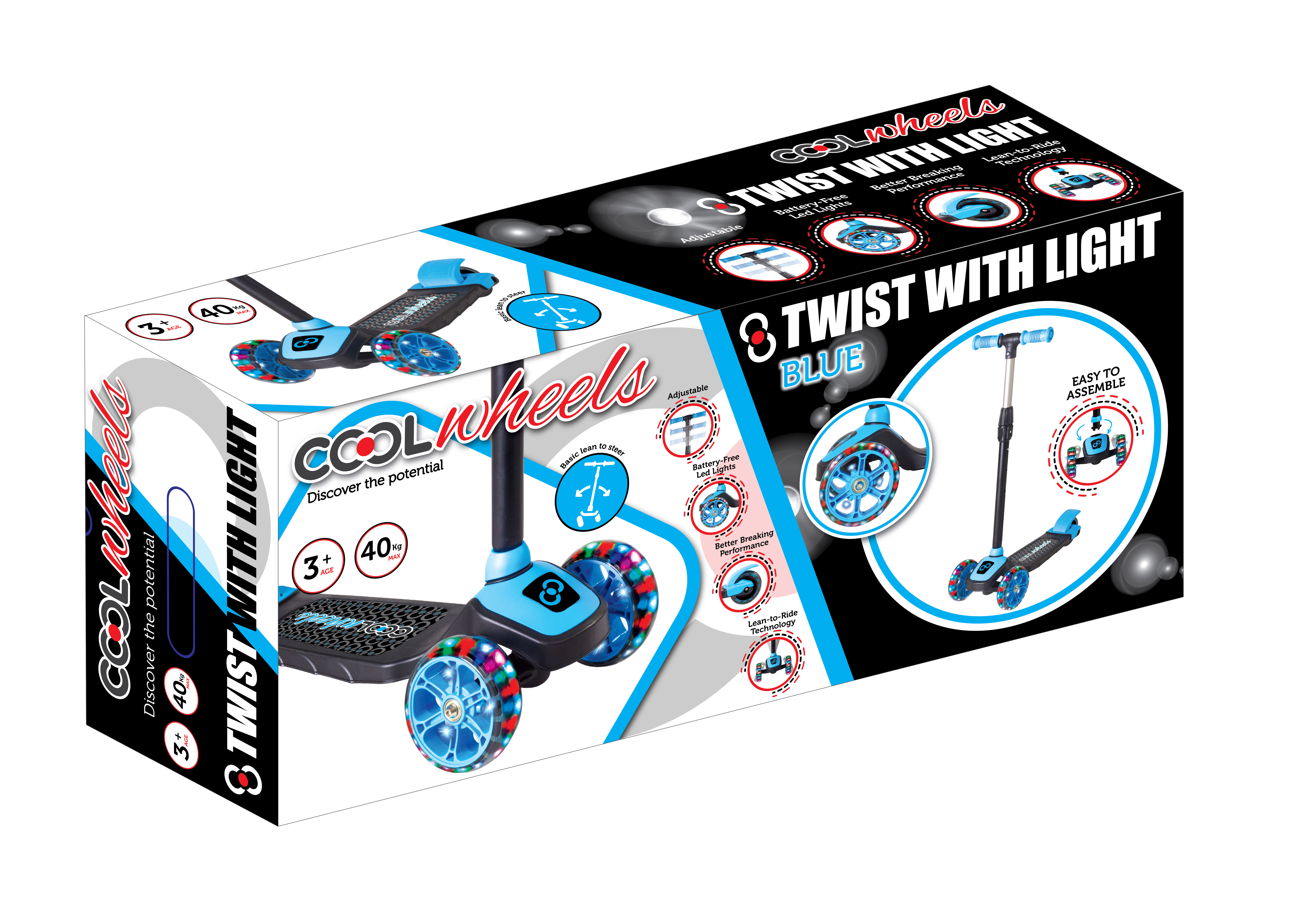 Cool Wheels Twist Scooter je moderan i bezbedan trotinet za decu koji kombinuje stabilnost, funkcionalnost i atraktivan dizajn sa svetlećim točkovima. Namenjen je mališanima uzrasta od 3 godine i više, a zahvaljujući sistemu upravljanja naginjanjem, predstavlja idealan prvi trotinet za razvoj ravnoteže i koordinacije pokreta. Savršen je izbor za vožnju u parku, dvorištu ili na ravnim gradskim površinama.