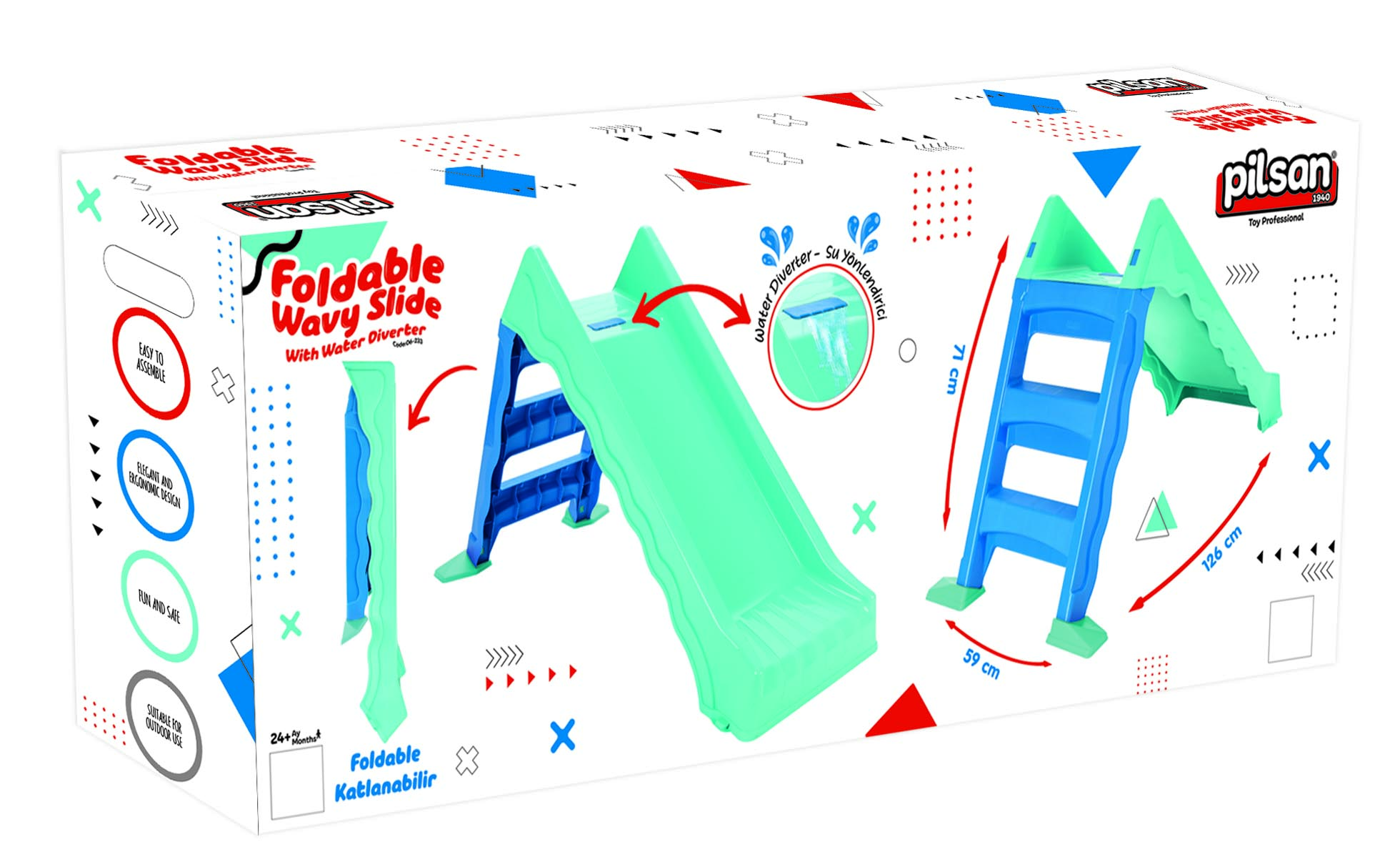 Praktična sklopiva konstrukcija omogućava da se tobogan lako odloži i prenese, bez zauzimanja mnogo prostora. Montaža i demontaža su jednostavne i brze, pa je idealan za svakodnevnu igru. Izrađen je od izdržljivog, stabilnog i laganog materijala koji je bezbedan za zdravlje dece i ne sadrži kancerogene supstance. Namenjen je mališanima starijim od 24 meseca, a kroz igru pomaže u razvoju motorike, koordinacije i podstiče druženje sa drugom decom.